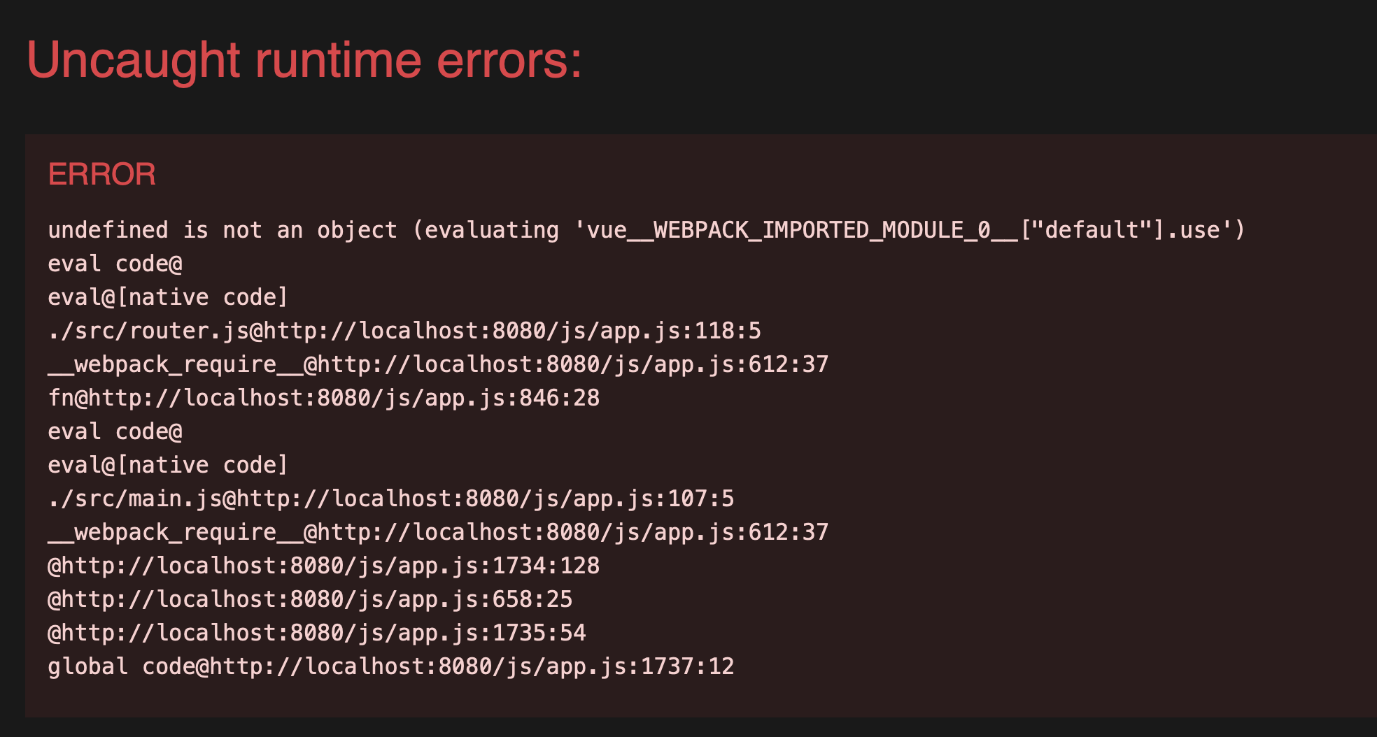 undefined is not an object (evaluating 'vue__WEBPACK_IMPORTED_MODULE_0__["default"].use') 오류는 Vue.js에서 Vue.use()를 호출할 때 발생하는 일반적인 오류이며, 주로 Vue.js 및 Vue 라우터 버전 충돌에 의한 문제가 발생했다.