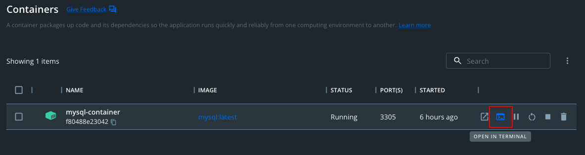 대시보드에서도 컨테이너와 연결된 터미널을 열 수 있다.